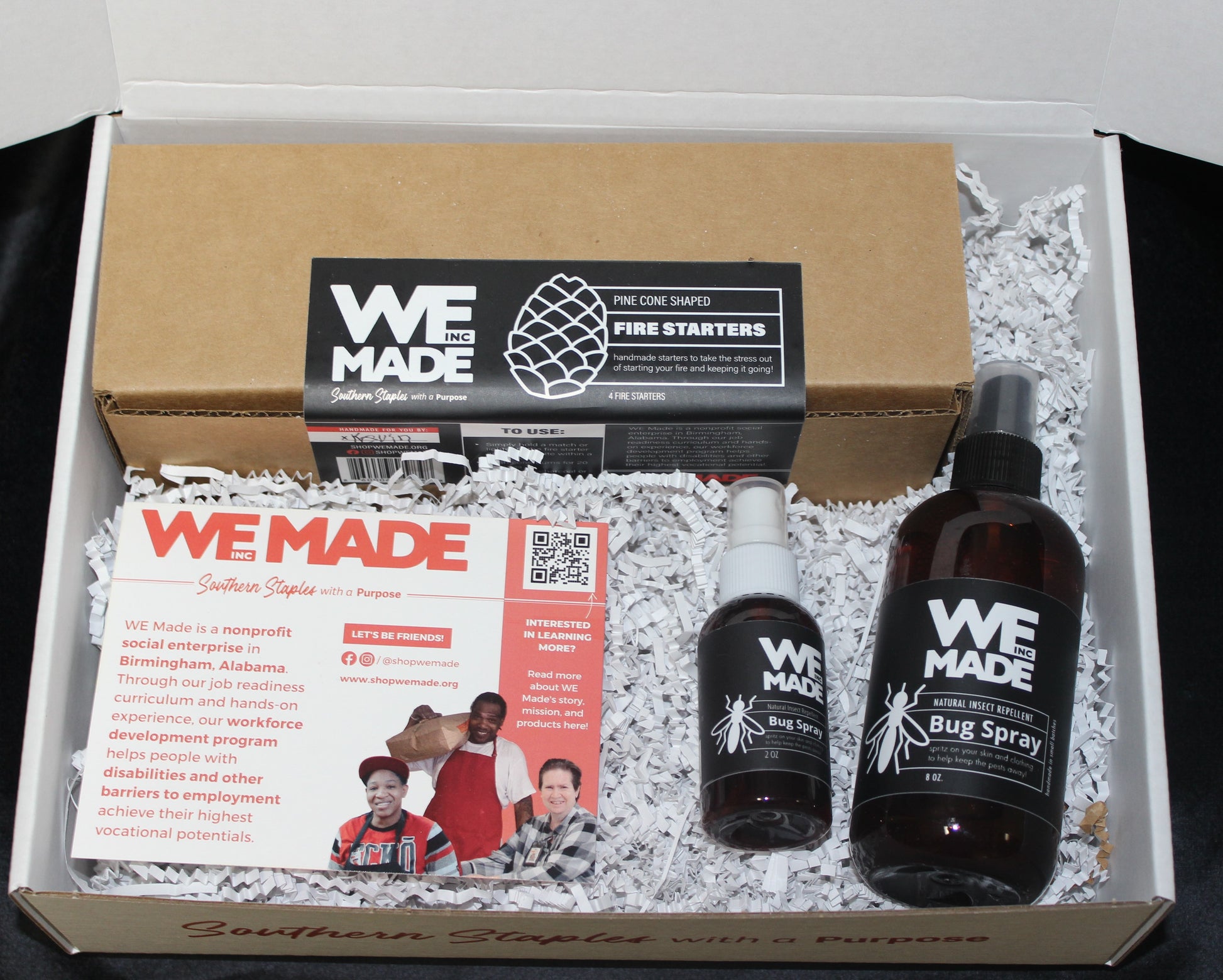 Venture into the outdoors with our Bug Spray and Fire Starters! Each box comes with a 2 oz. and 8 oz. bug spray as well as a box containing 4 of our handmade fire starters.