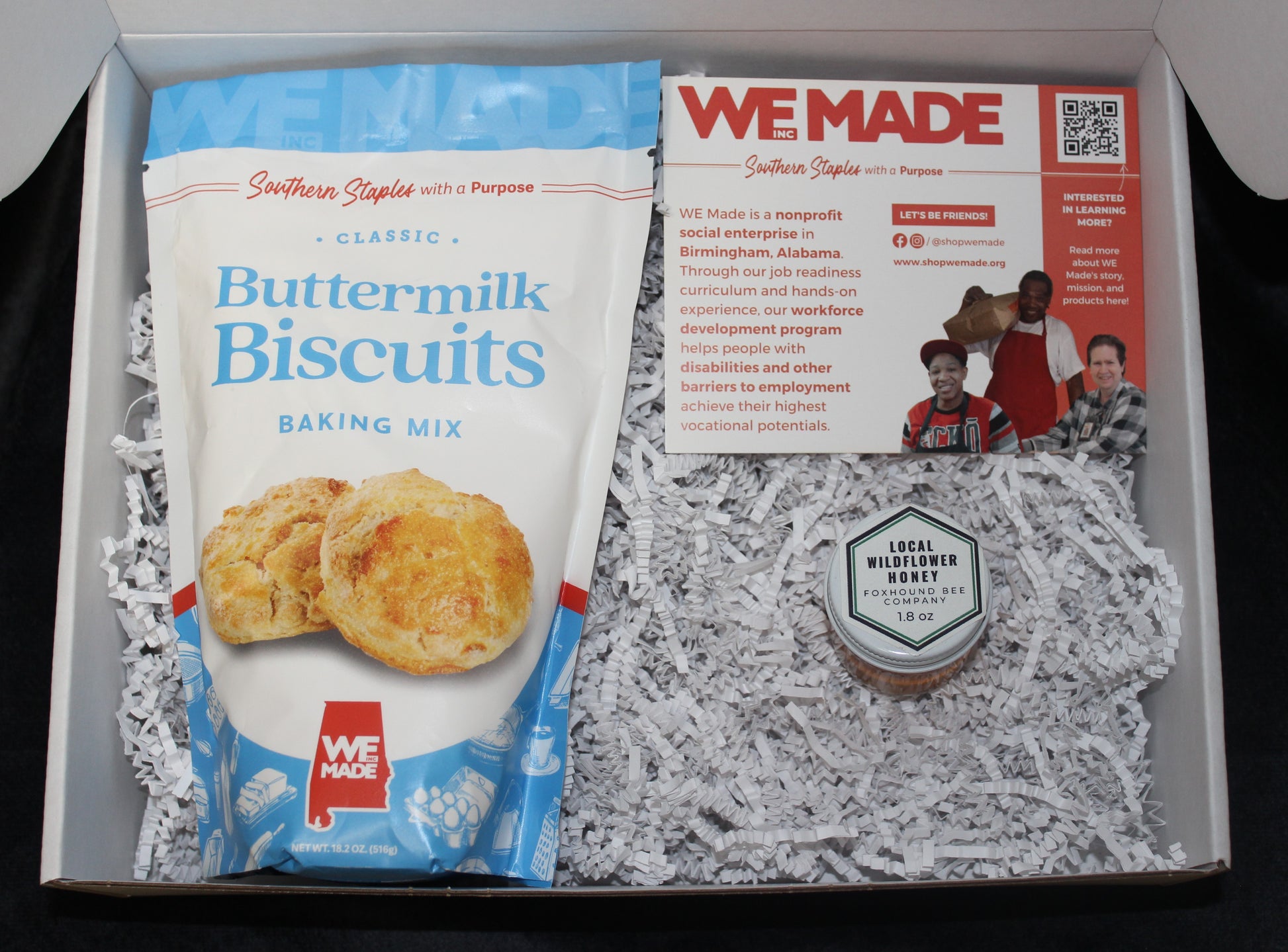 This gift is the perfect duo: pairing WE Made’s Buttermilk Biscuit Mix with Foxhound Bee Company Honey